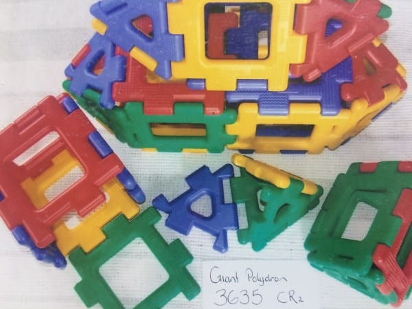 18 triangles ( 5 red, 5 yellow, 4 blue, 4green) 20 square open shapes ( 5 red, 5 yellow, 5 blue, 5 green) Large Bag with blue trim