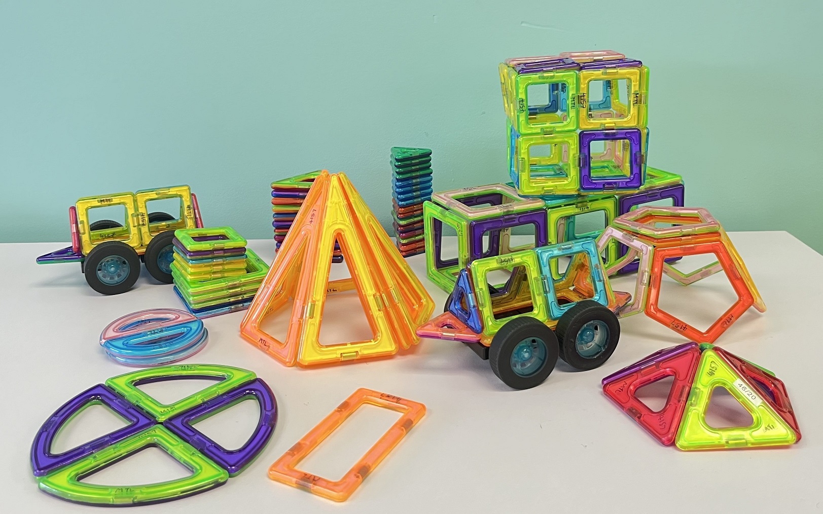 3 wheel bases 3rectangles 6 pentagons 36 small squares 24 small triangles 16 medium triangles 4 semi circles 4 curved triangles 8 large triangles 18 large squares 1bag